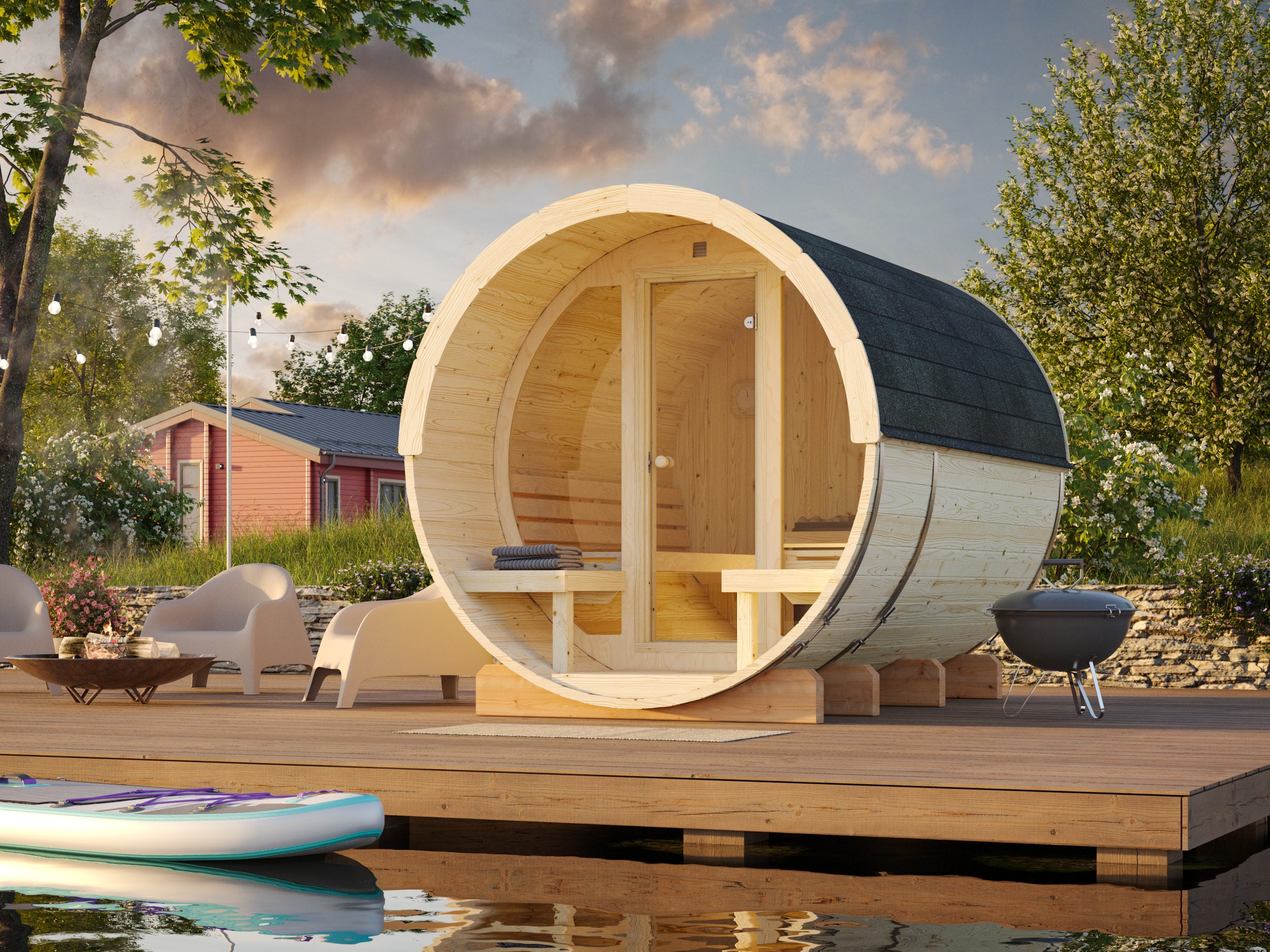 Introducing the Anita L Timber Garden Barrel Sauna with Glass Wall, a premium addition to our garden sauna range that combines traditional Scandinavian sauna culture with a touch of modern luxury. Perfect for those who appreciate spacious interiors and expansive views, this model features a glass wall that not only enhances the aesthetic appeal but also invites natural light into the sauna, creating a bright and airy atmosphere.