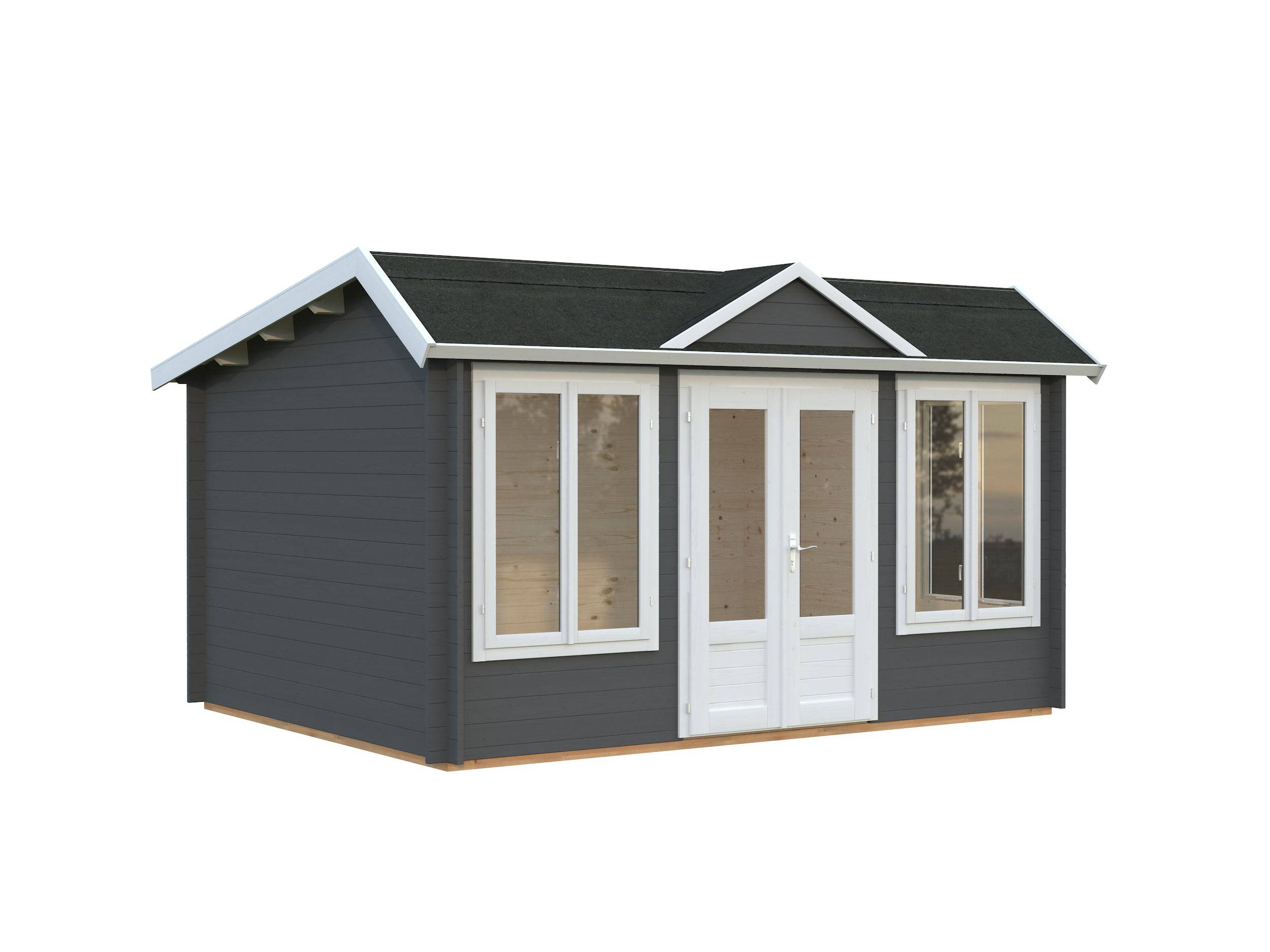 The kit includes treated foundation joists, 19 mm tongue & groove floorboards, fasteners, and double-glazed doors and windows. Optional extras such as roof covering, nails, and rain gutters are available separately. The cabin is delivered untreated and should be treated both inside and out immediately after assembly to ensure long-term durability. Backed by a 5-year guarantee, it’s a reliable and elegant addition to any UK garden.