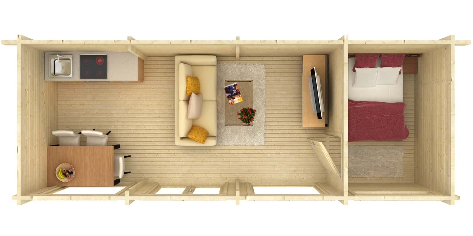 The main room of the Heidi XL is a testament to airy and bright interior design, with abundant light pouring in through the front windows and doors, creating an uplifting atmosphere for work or relaxation. The second room, while still benefiting from natural light, offers increased privacy, making it an ideal space for a secluded office, a secure storage area, or a tranquil bedroom retreat.