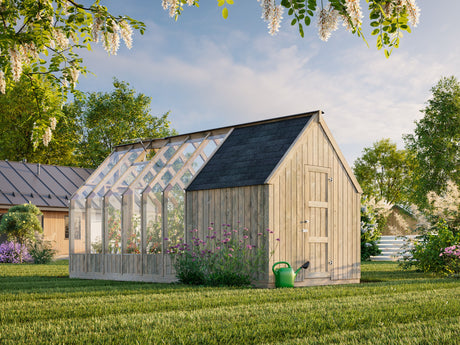 £3,99000Unit price /UnavailableEmilia M+ (2,4x5,5m|8,2+4,0m2|18mm ) Greenhouse with Tool Shed - Pressure Treated