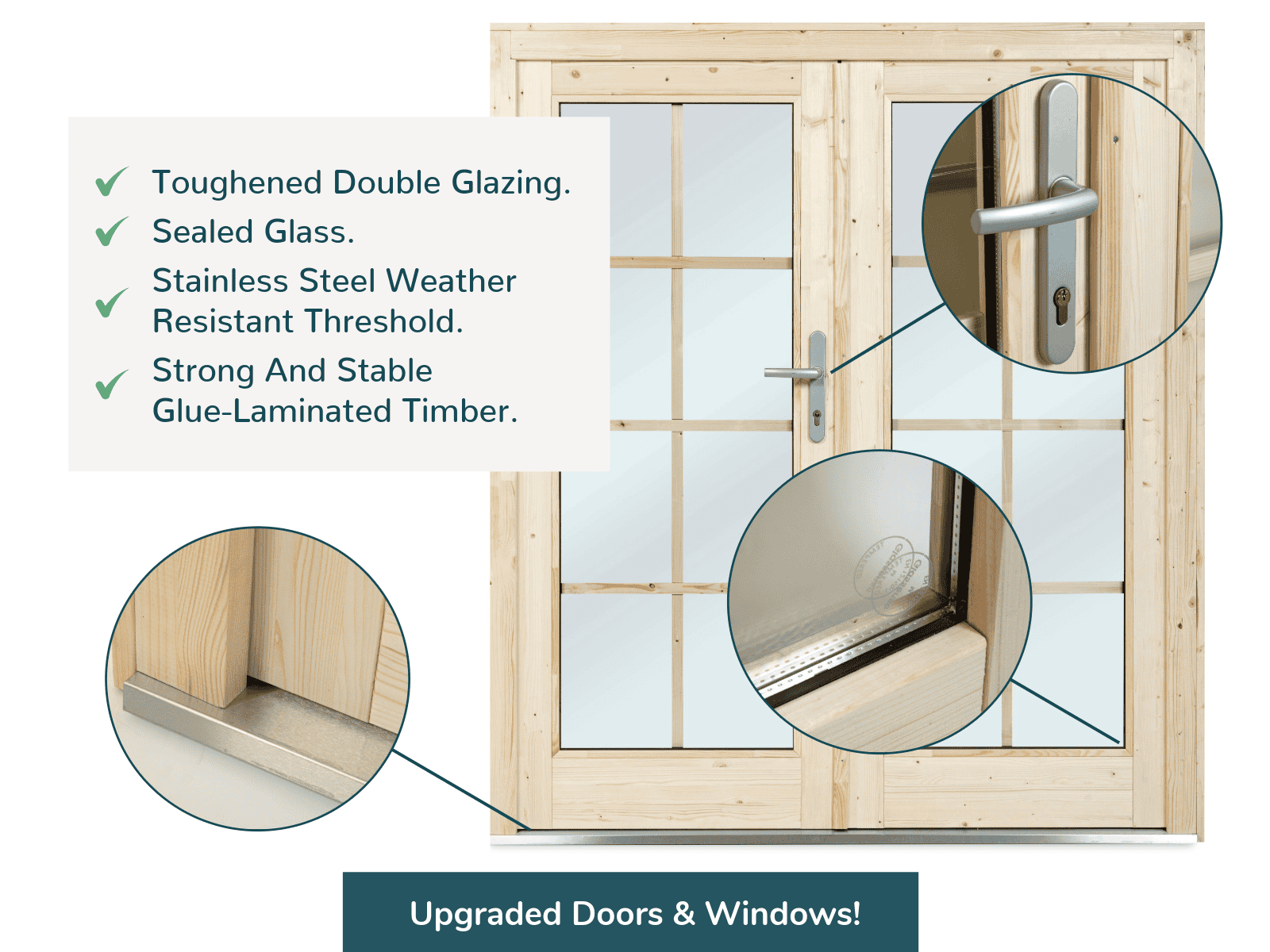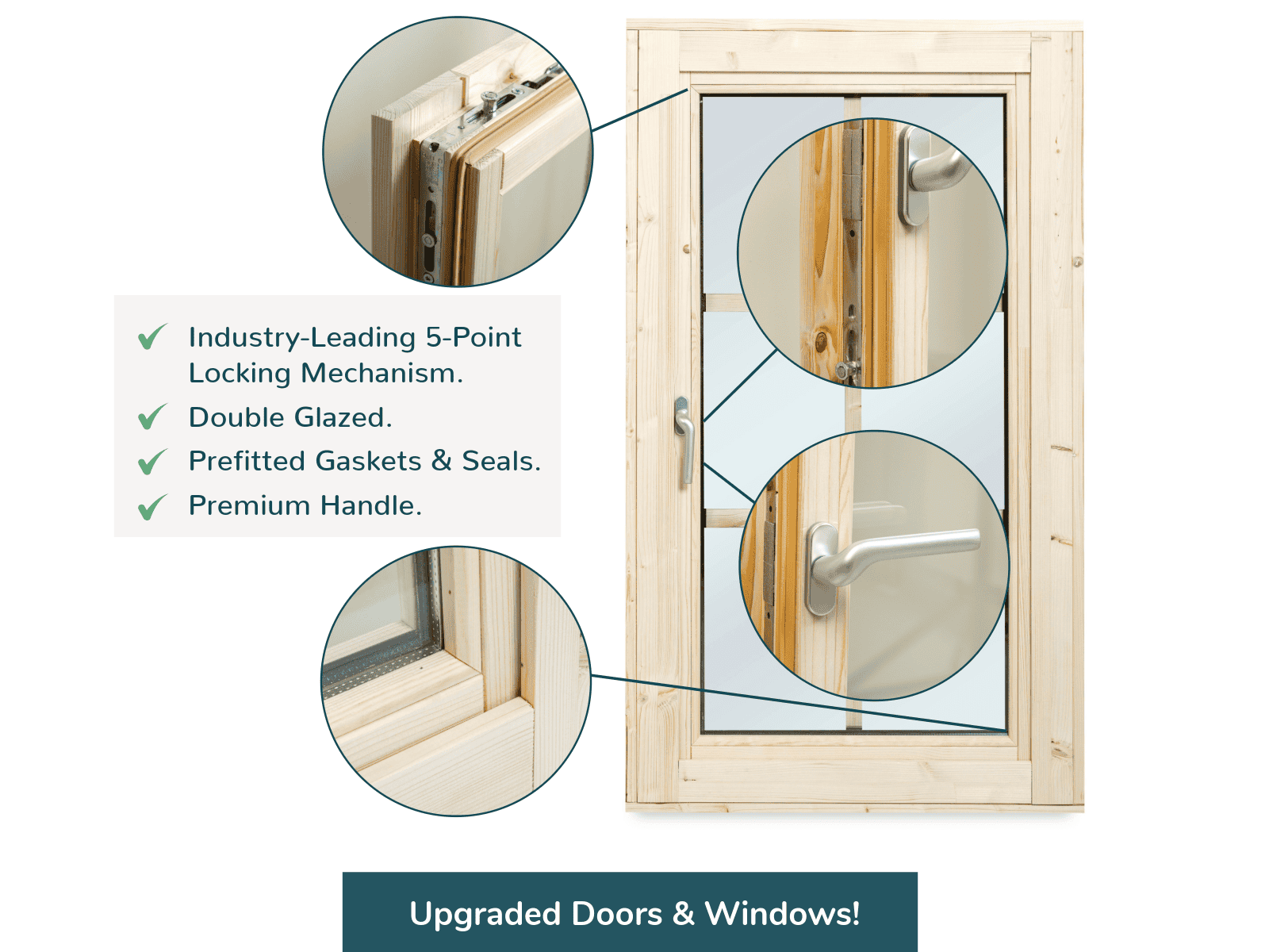 • Wall Construction: 44mm thick logs with double-notch joints for enhanced insulation.