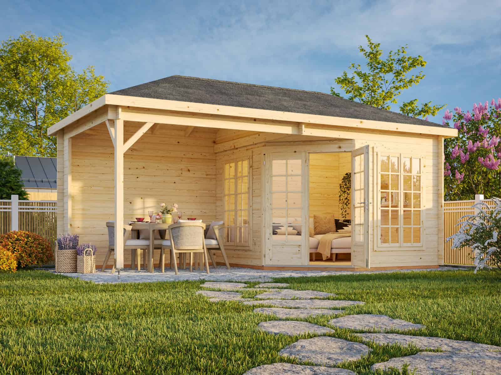 Introducing the Melanie XXL, a uniquely designed summer house that seamlessly blends luxury with functionality. This wooden log cabin with a large gazeebo area, making it a perfect choice for those who enjoy outdoor living with the comfort of an indoor feel. It's an elegant addition to any garden, providing ample space for relaxation, entertainment, and storage under one roof.