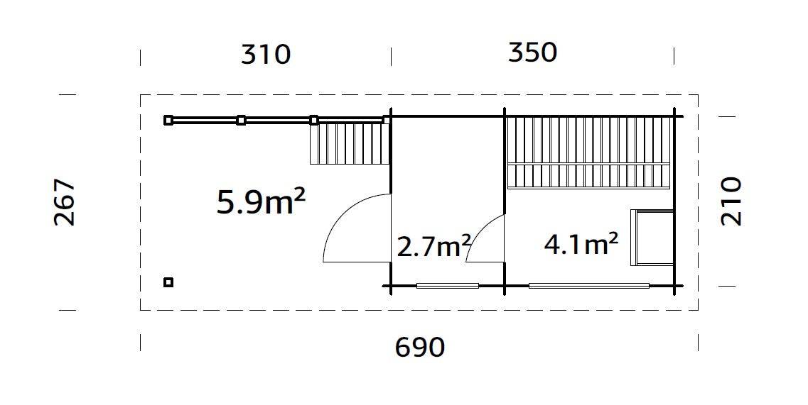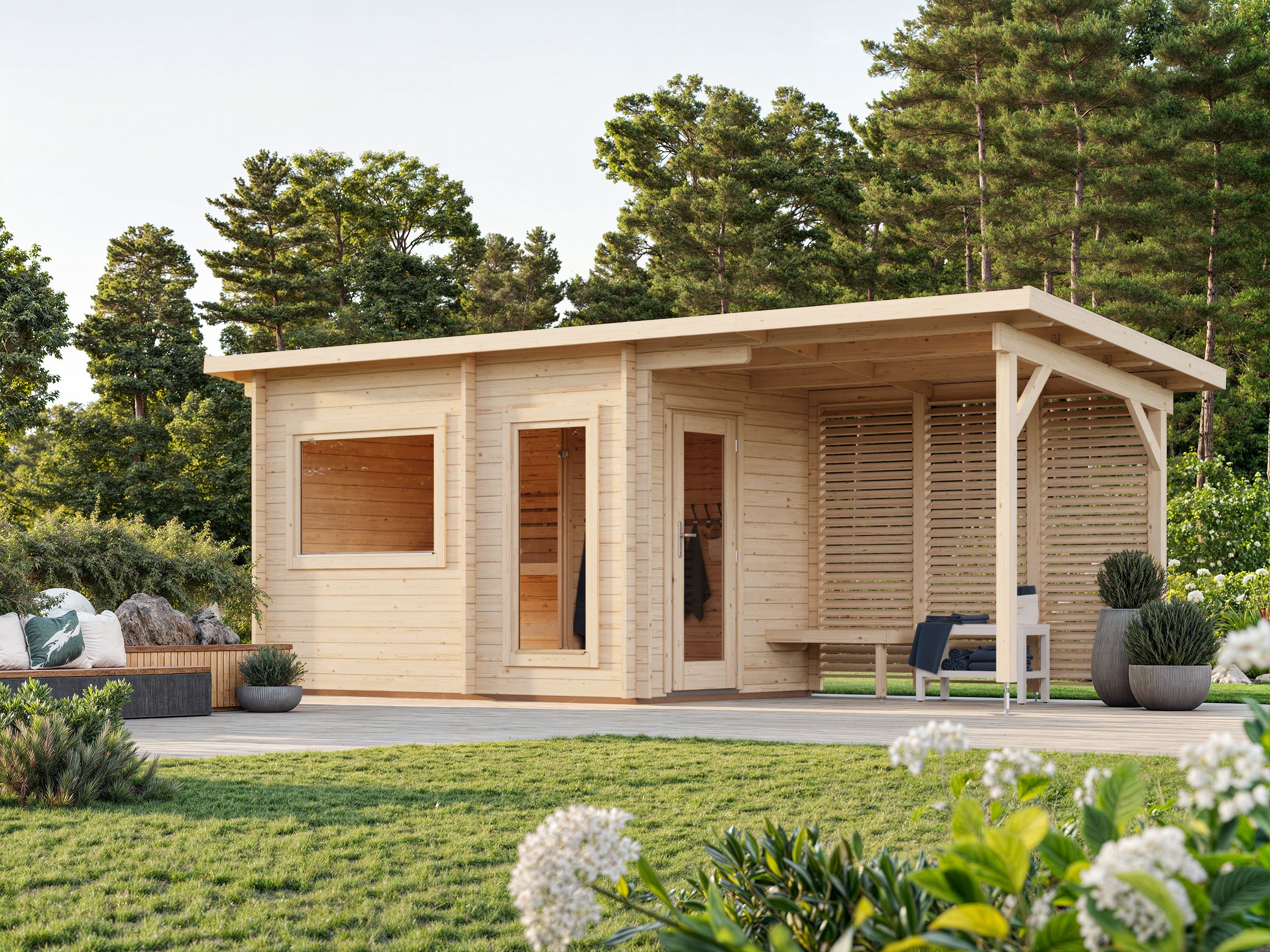 Sanna M+ (6.5x2.5m | 6.8+5.9m2 | 44mm) Modern Garden Sauna with Dressing Room and Canopy