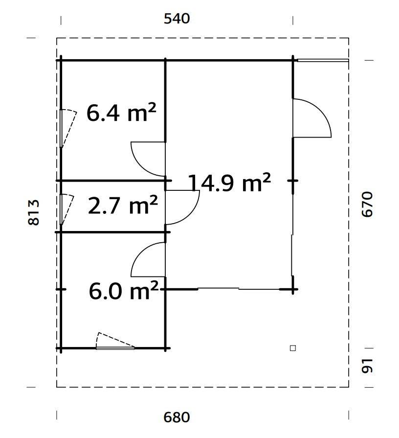 The Cecilia 30.0 m² Slide Plus is a contemporary weekend house that combines sleek design with practical comfort. Measuring 5.6 m x 6.9 m, this modern cabin is crafted from 70 mm thick Nordic spruce wall logs, offering excellent insulation and long-lasting durability. With stylish aluminium sliding doors and windows, the cabin is flooded with natural light, creating a bright and inviting atmosphere ideal for weekend getaways or guest accommodation.